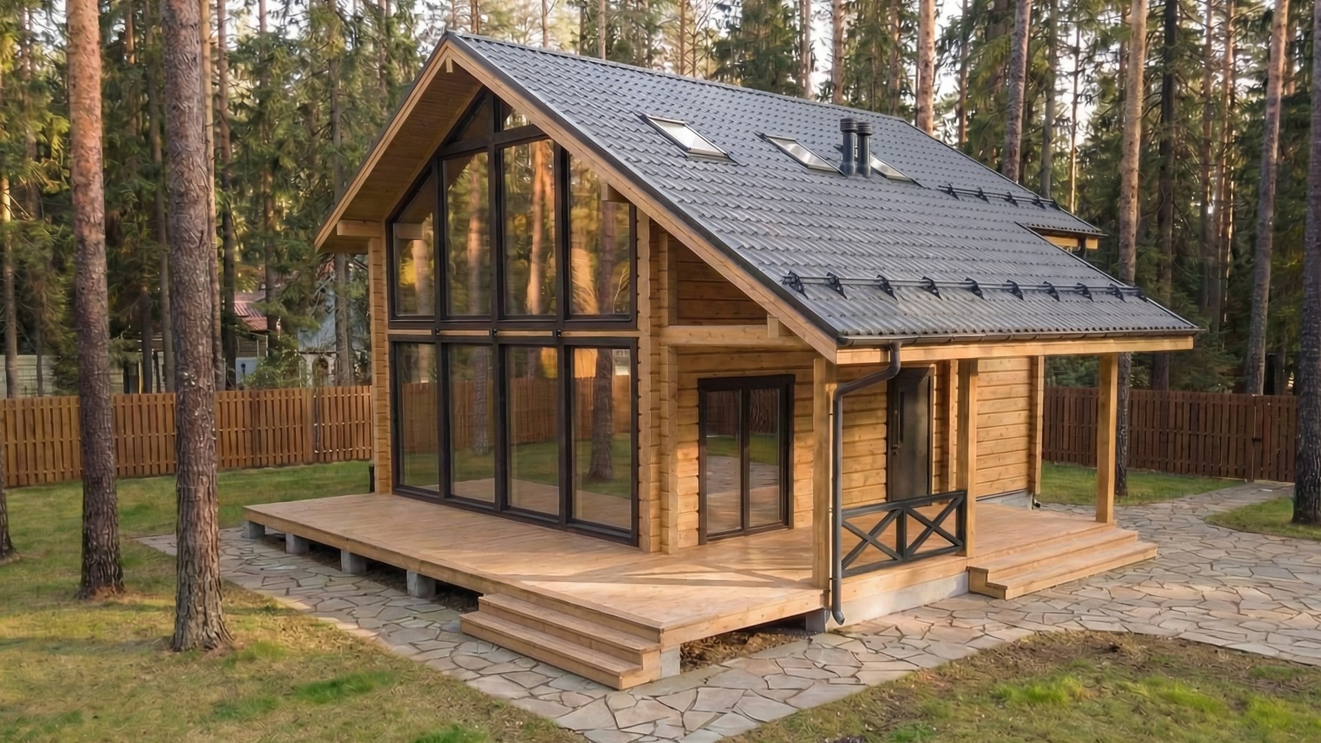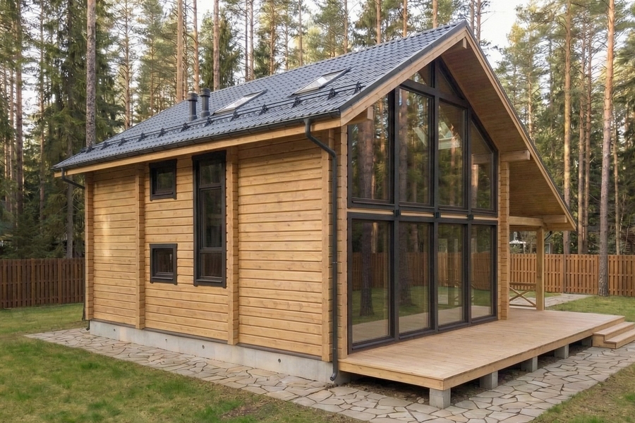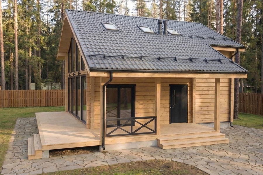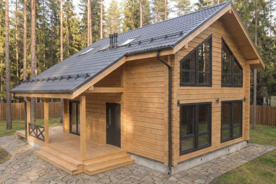 Дополнительным плюсом стала открытая веранда перед домом — уютное пространство для завтраков на свежем воздухе, вечерних посиделок и наслаждения природой. Архитектура из клееного бруса создает теплую, экологичную атмосферу и подчеркивает статус объекта.