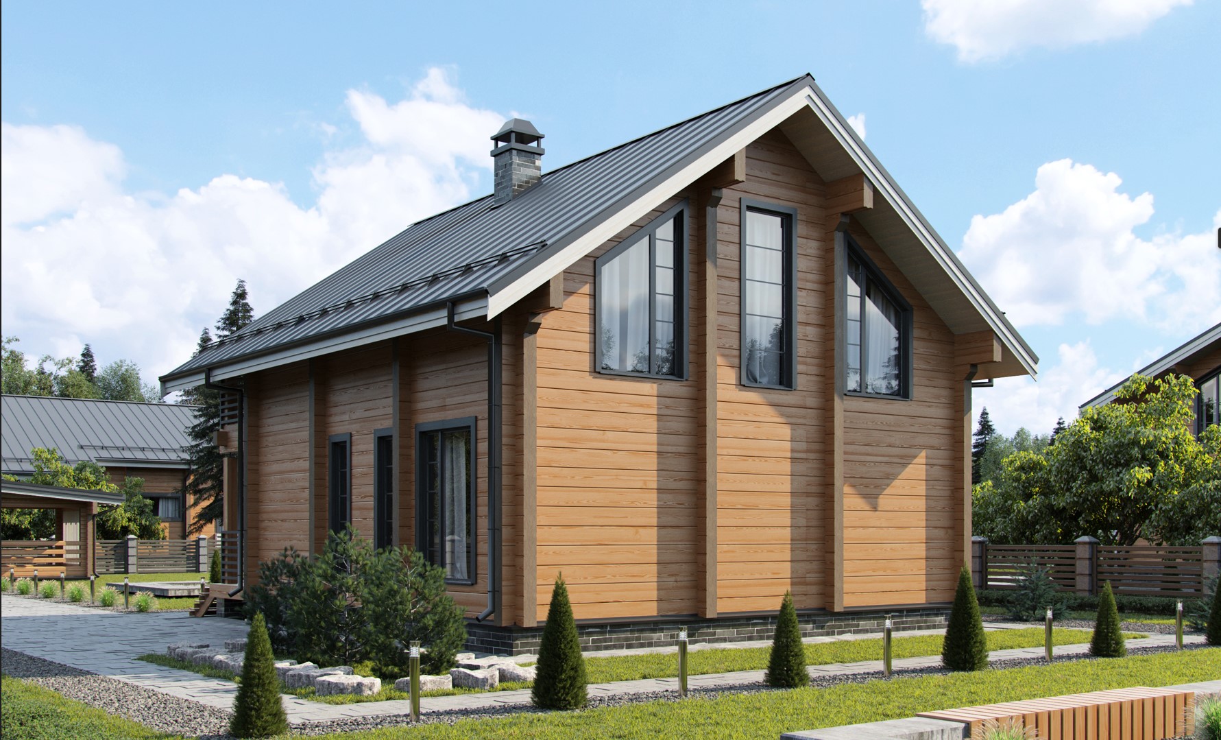 • Стропильная система из доски камерной сушки (сосна) 50х200мм, обрешетка из бруска 50х50мм, контробрешетка и внутренняя обрешеткам из доски 25х100мм.