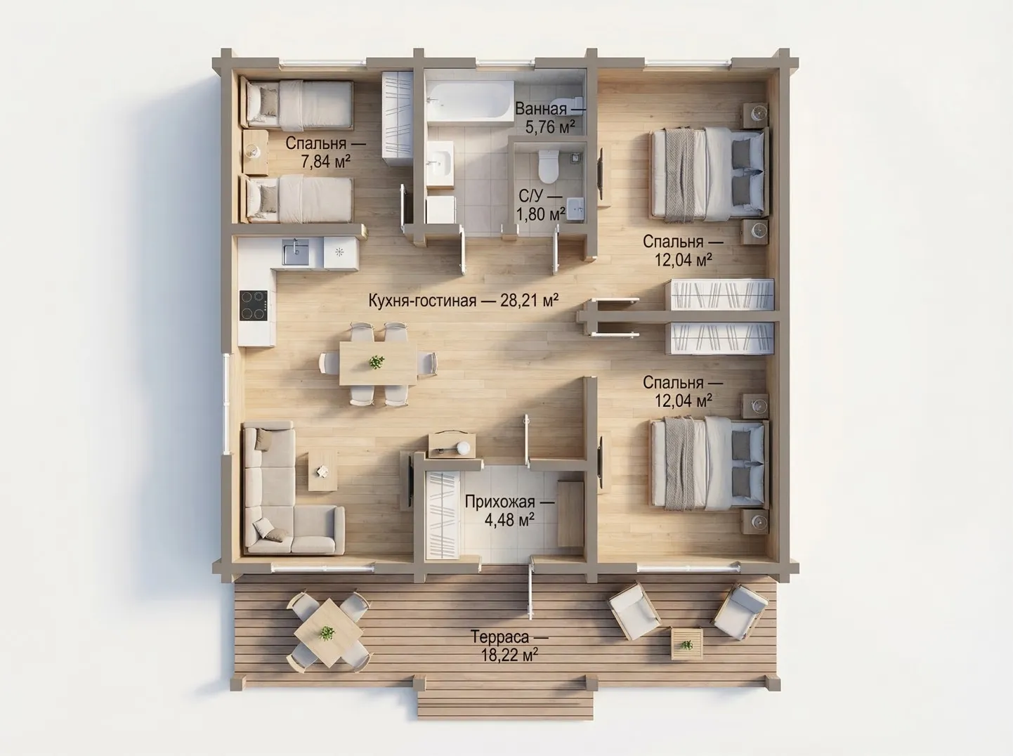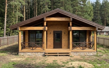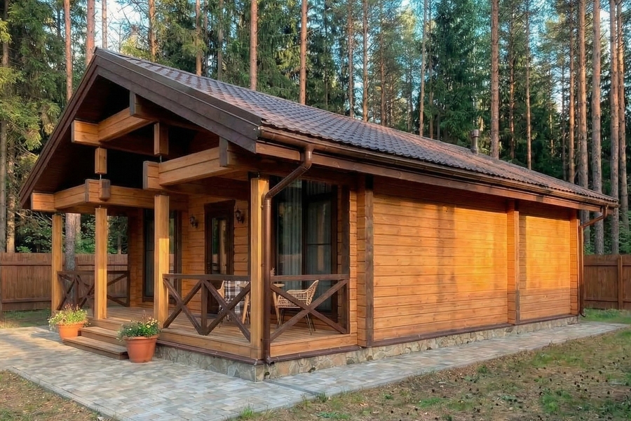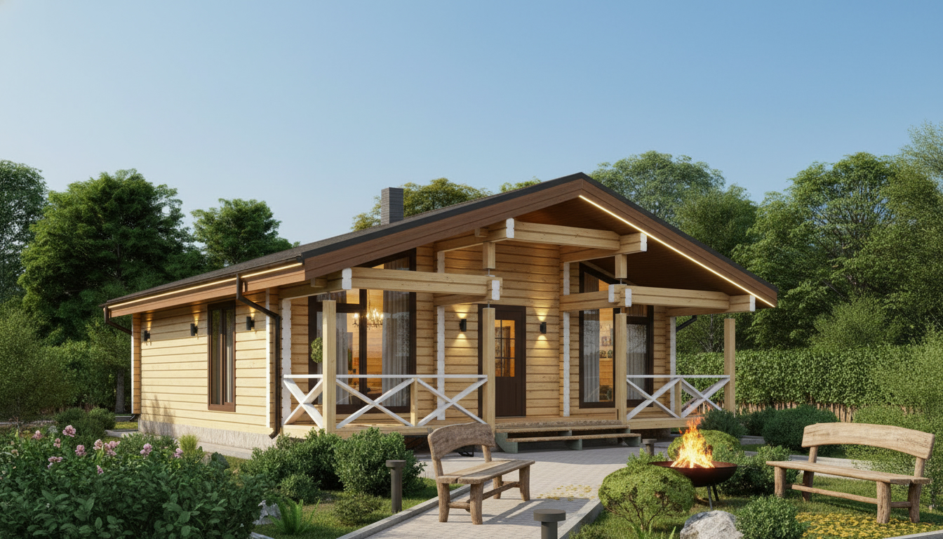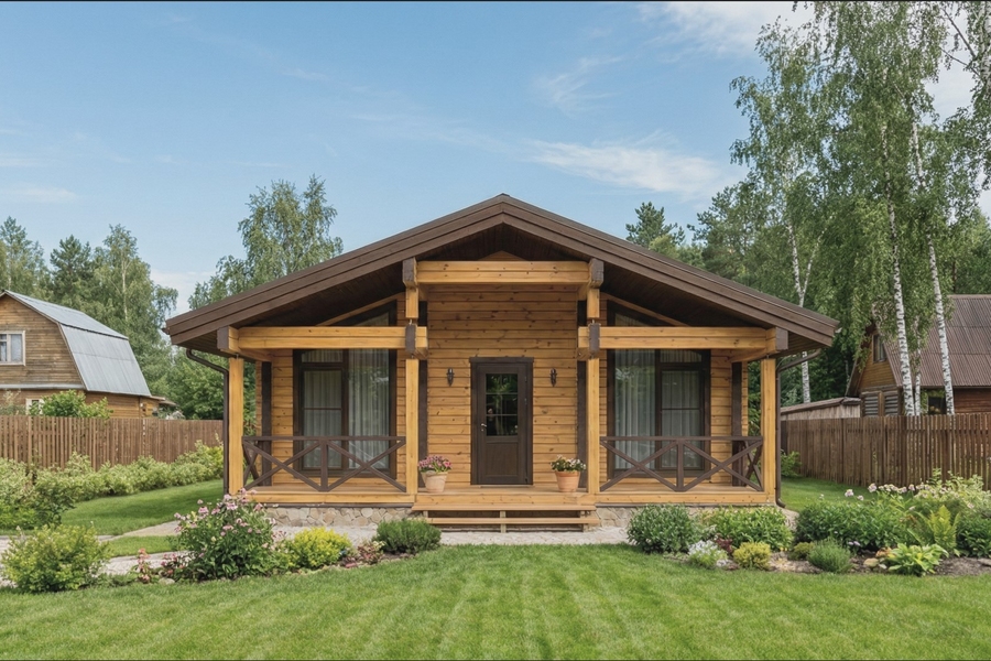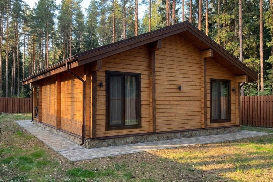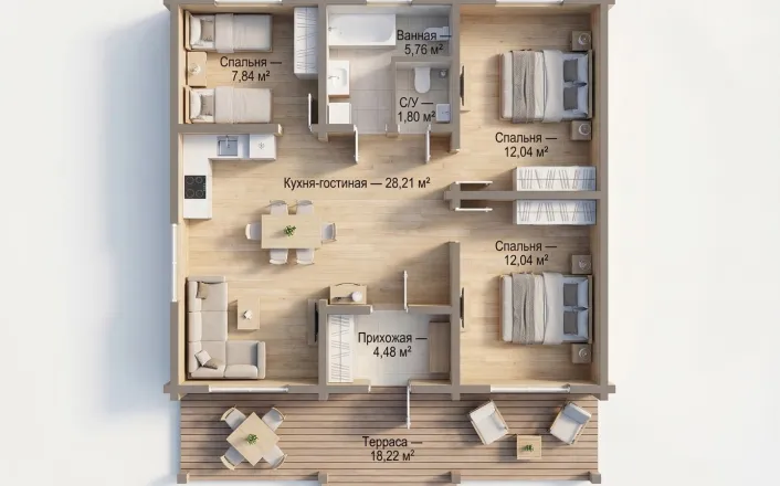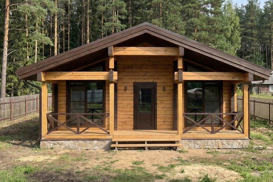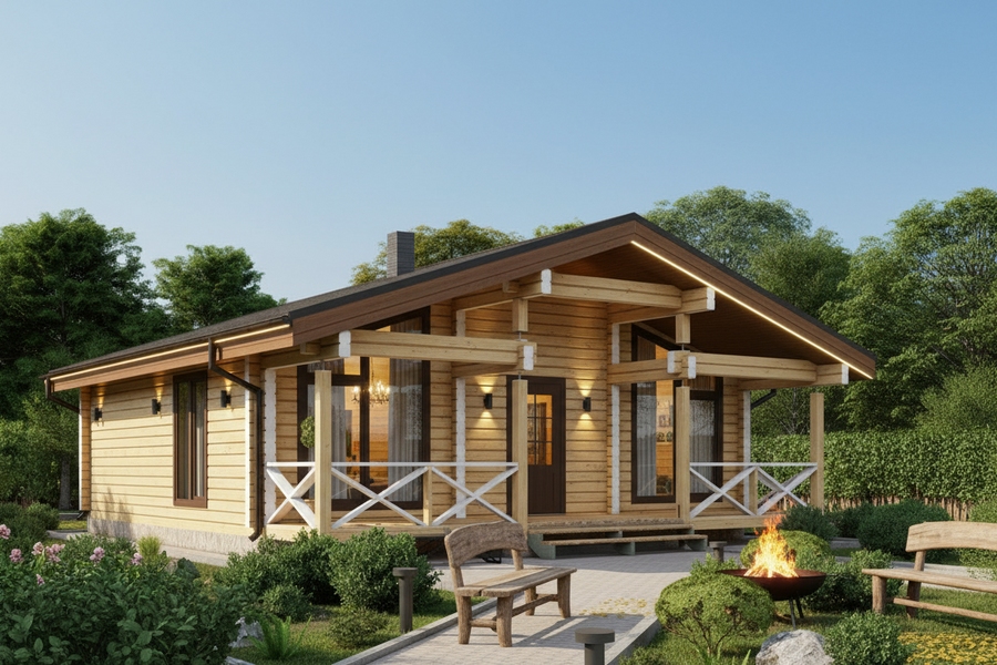 Планировка с сауной включает две изолированные спальни, просторную кухню-гостиную площадью более 28 м², санузел и полноценный банный блок с парной и душевой. Комната отдыха становится центральным пространством дома — здесь удобно собираться всей семьей или принимать гостей. Выход на террасу расширяет жилое пространство и делает дом особенно удобным в теплое время года.