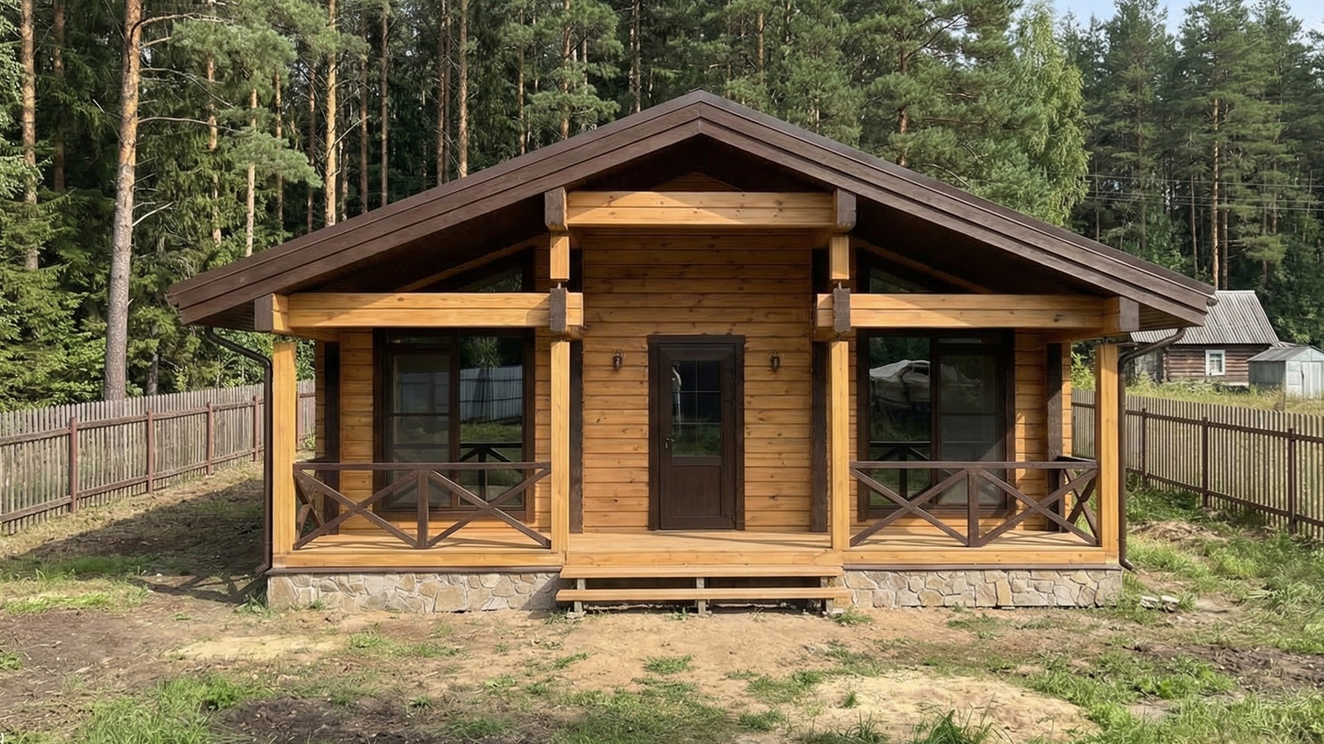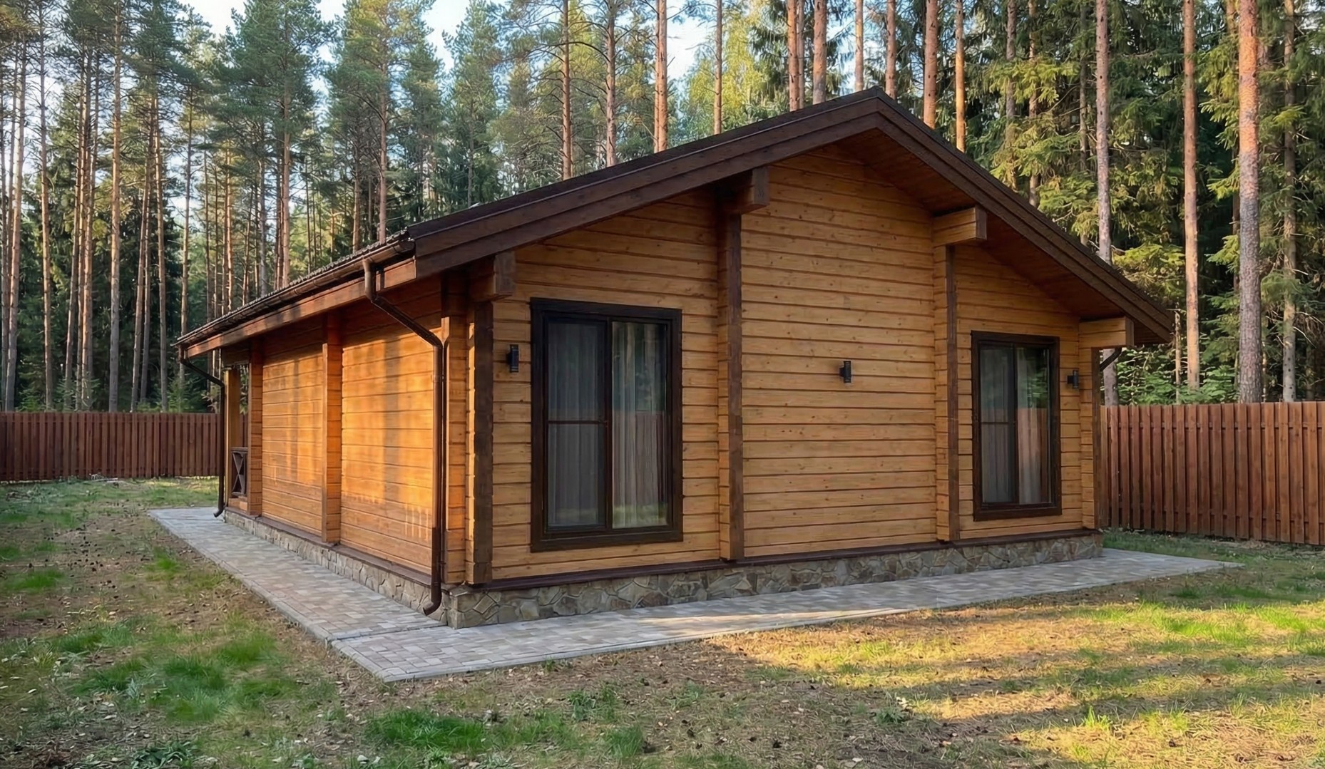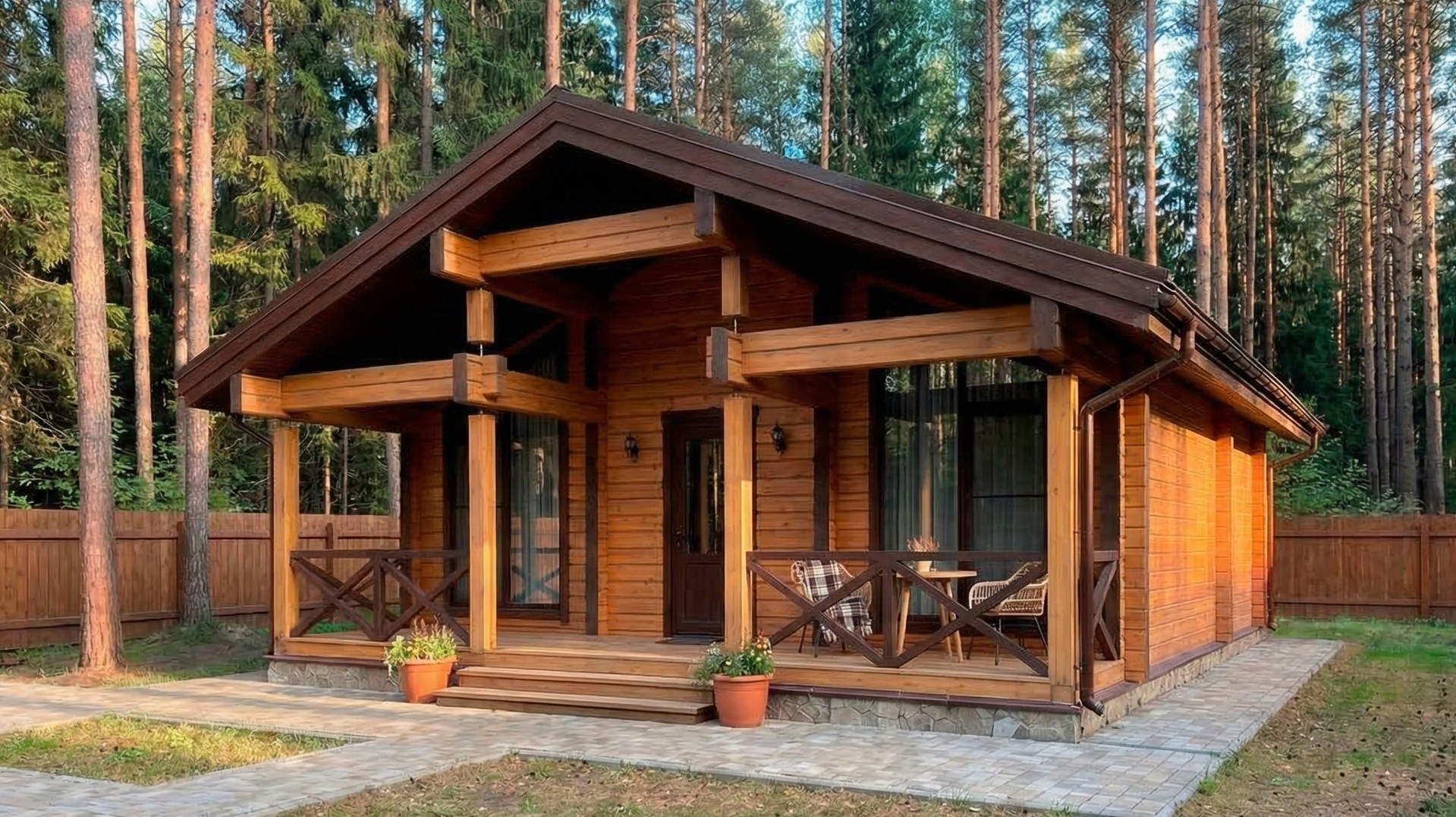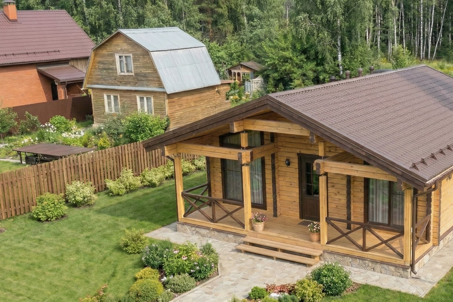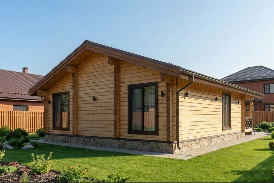 Планировка с сауной включает две изолированные спальни, просторную кухню-гостиную площадью более 28 м², санузел и полноценный банный блок с парной и душевой. Комната отдыха становится центральным пространством дома — здесь удобно собираться всей семьей или принимать гостей. Выход на террасу расширяет жилое пространство и делает дом особенно удобным в теплое время года.