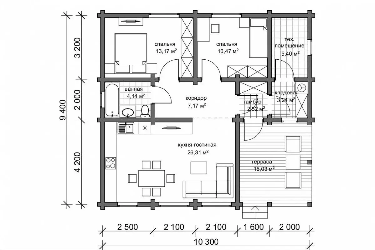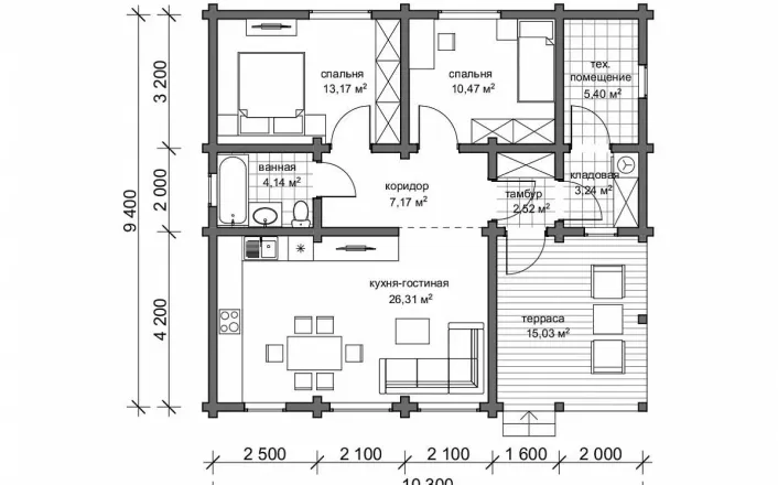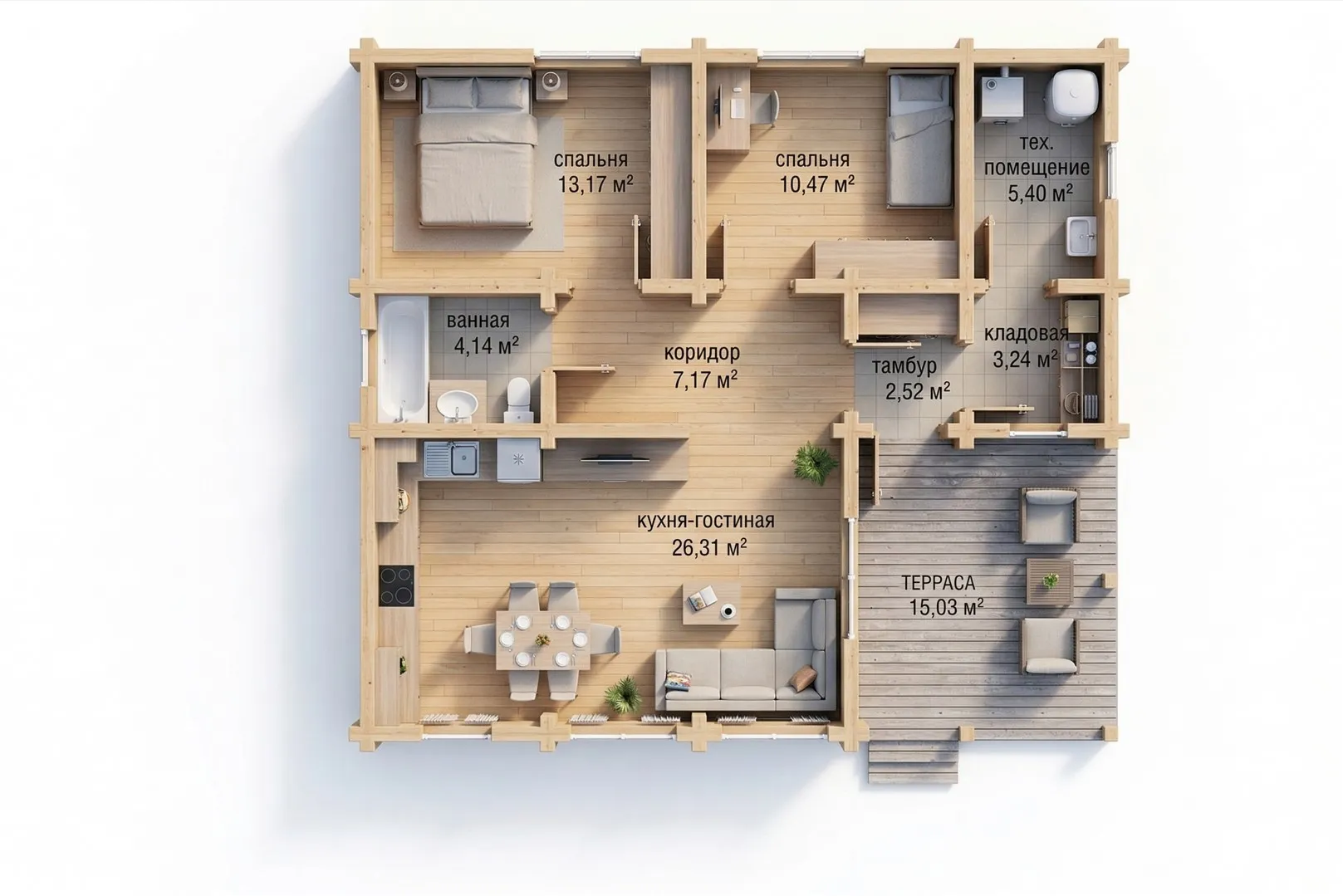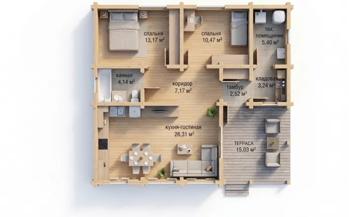 Планировка продумана до мелочей: просторная кухня-гостиная становится центром дома, где удобно проводить время с семьёй и друзьями. Две изолированные спальни обеспечивают приватность, а наличие технического помещения, кладовой и удобного санузла делает проживание максимально комфортным.